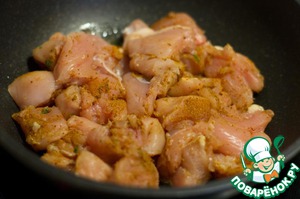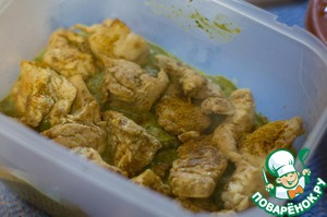 Затем в посуду выкладываем слоями курицу без бульона, приправляем специей для сациви, и орехово-пряный соус. Пусть пропитаются ароматами.