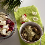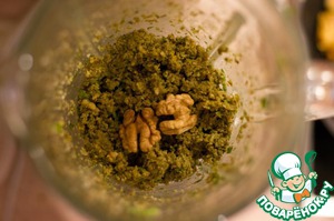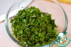 Прокручиваем кинзу и орехи через мясорубку, но у меня её нет, поэтому я порубила зелень.