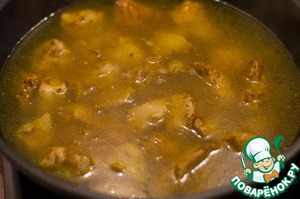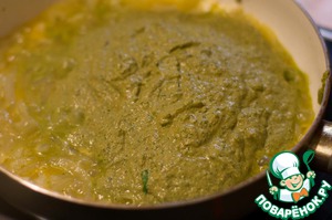 Часть бульона добавляем в лук. Я часть оставила, и всё таки в блендере порубила орехи с зеленью при помощи бульона. Этот соус выливаем к луку.