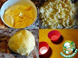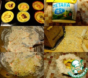 Половину крабовых палочек ТМ " Аморе" нужно крупно порезать и положить в каждую форму, застеленную тестом.