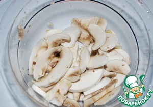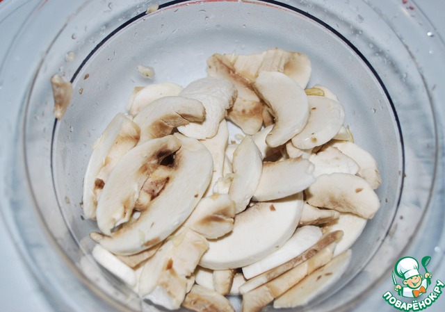 Шампиньоны почистить, удалить внутреннюю часть шляпки и нарезать тонкими дольками. Полить соком лимона.