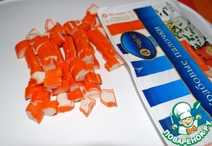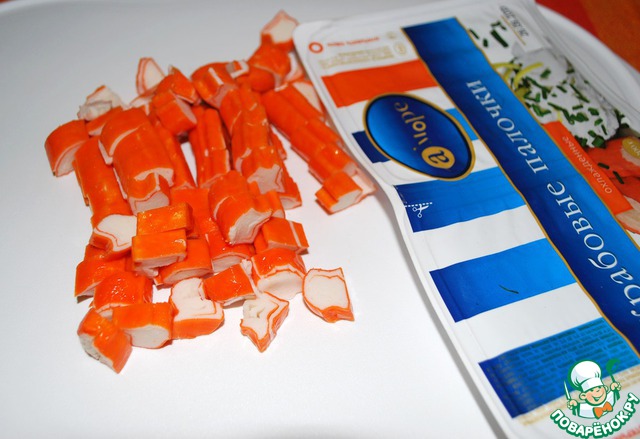 Крабовые палочки нарезать на ломтики 0,5 см. шириной.