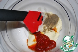 Приготовить заправку: перемешать майонез, сметану (или йогурт), кетчуп, перец красный и черный молотый. По вкусу соль (я не добавляю, мне достаточно той, что есть в соусе).