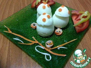 На блюдо переворачиваем яйца начинкой вниз, сверху одеваем "шапочку" и украшаем по желанию.