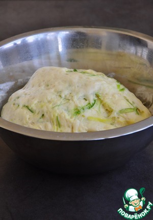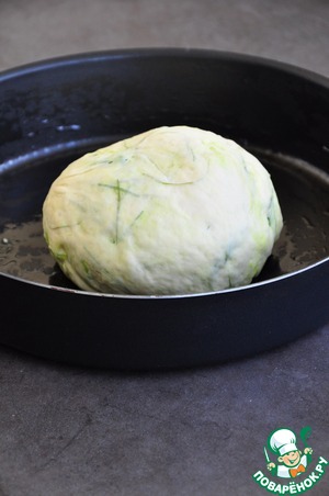 Из муки, теплой воды, дрожжей, растительного масла, соли и сахара замесить тесто. Добавить водоросли, вымесить тесто до однородности. Накрыть пищевой пленкой и дать минут 20 подойти. Вымесить еще немного, чуть присыпая мукой.