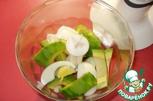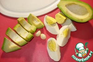 Авокадо моем, чистим (нам понадобится половинка). Чеснок чистим. Авокадо и варёное яйцо режем кусочками.