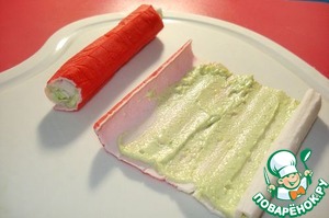 Затем аккуратно разворачиваем крабовые палочки и тонким слоем выкладываем нашу начинку.