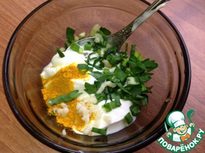 - Специи (Соль, перец черный молотый, кинза молотая, хмели - сунели, орегано) — 0,1 ч. л.