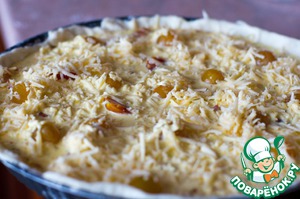 Тесто прокалываем вилком, что бы оно не пузырилось. Высыпаем на тесто грудинку с луком, заливаем смесью яично-сметанковой, сверху сыр.