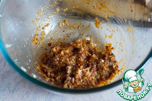 • Режем чеснок, либо давим через давилку. Смешиваем с маслом, аджикой и чесноком.