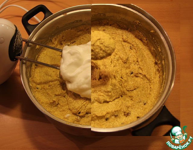 Взбиваем белки до состояния мягких пиков. Вводим в полученную массу и перемешиваем на низкой скорости (при меньшем количестве лучше ложкой)