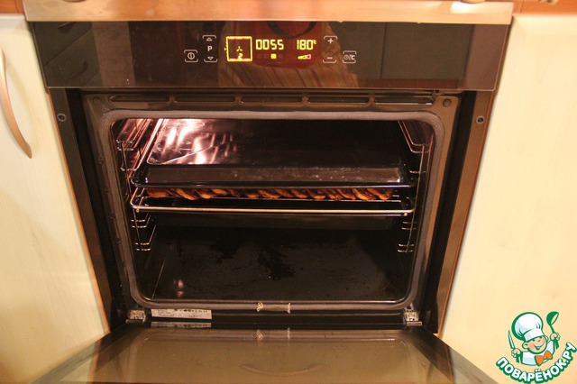 Помещаём решётку в духовке между двух противней. И печём 10 минут.