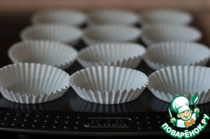 В форму для кексов кладём бумажные стаканчики, или просто смазываем форму, кому как удобно.