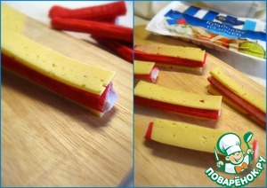 Из сыра нарезать пластины по длине и ширине крабовых палочек. Крабовые палочки положить между двух полосок сыра.