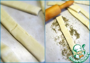 Тесто нарезать на полоски по количеству крабовых палочек. Раскатать тесто по длине на пряной смеси, чтобы она осталась на тесте.