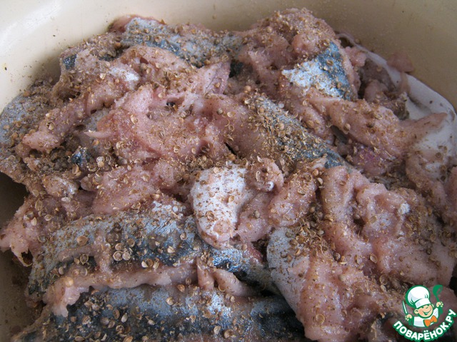Скумбрию освобождаем от костей и кожицы, солим, перчим, посыпаем кориандром, поливаем соком лимона, перемешиваем и оставляем на часик промариноваться.