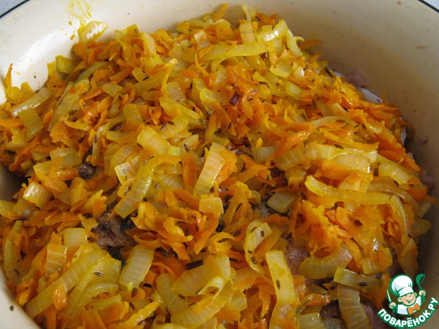 Лук шинкуем кольцами, морковь трём на крупной тёрке, обжариваем до прозрачности лука, посыпаем тмином или зирой, солим. Выкладываем в чашку с рыбой, покрывая её овощным одеялом. А теперь небольшое отступление. Я являюсь экономной хозяйкой, и поэтому у меня идёт в расход всё, даже кости и головы рыбы. Из костей и головы я варю бульон, который впоследствии используется для приготовления гарнира. Так что аромат рыбки везде ))) Так же замачиваю хлеб для фарша, тоже в рыбьем бульоне. Для информации: кости и головы проварить, посолить и процедить.