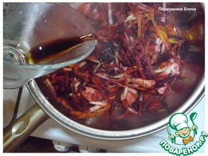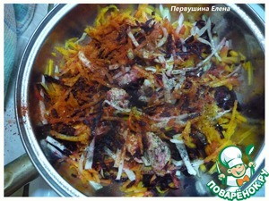 Налить в сковороду масло и обжарить лук с морковью, добавить мясо, залить водой и тушить 20 минут под закрытой крышкой на маленьком огне. Положить капусту, тыкву, свеклу и, не закрывая крышку, тушить минут 10. Вода немного выпарится.