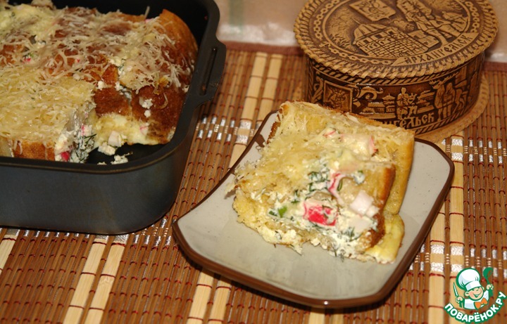Лариса, принимай отчетик.Готовила это блюдо уже не раз, но никак не успевала сфотографировать, к утру ничего не оставалось .Очень быстрое, необычное, вкусное получилось блюдо. Хлеб получился румяный,хрустящий и одновременно очень нежный внутри, а сочетание творог-крабовые палочки пришлось по вкусу всем членам нашей семьи.