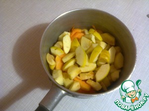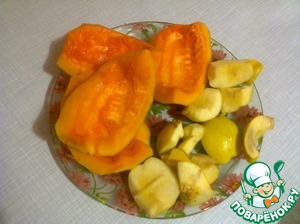 • Чистим тыкву от семечек, прожилок и кожицы. Из айвы вырезаем сердцевину.