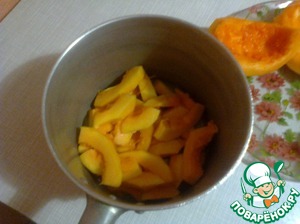 • Режем тыкву кусочками хаотично, складываем в кастрюльку.