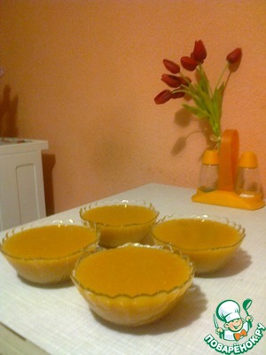 • Тыквенную смесь вместе с водичкой измельчаем блендером, делаем пюре. На этом этапе можно остановиться, так как пюре очень вкусное=) Но мы все же пойдем дальше=) Добавляем в пюре желатиновый раствор, предварительно процедив его (чтобы не было не растворившихся комочков) Разливаем в пиалы, или любую другую посуду (стаканы, креманки и т. д.)После остывания убираем в холодильник.