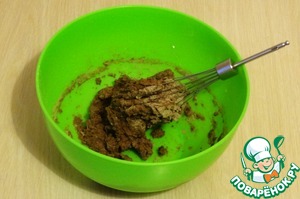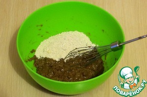 Добавить 150 мл кипятка. Хорошо перемешать. Добавить ванилин и размолотые овсяные хлопья (я перемалываю их в муку в кофемолке). Перемешать до однородности.