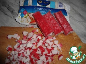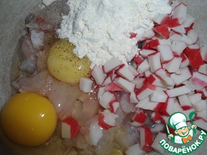 Соединить нарезанное филе пангасиуса с крабовыми палочками, добавить яйца, муку, посолить, поперчить на свой вкус.