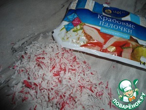 Крабовые палочки натереть на мелкой терке.