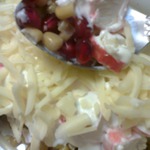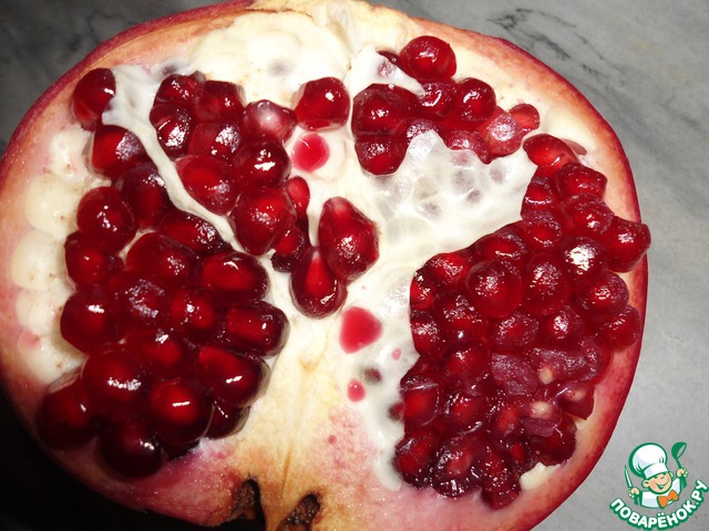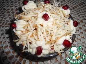 Сверху посыпаем тертым сыром. С помощью шприца я выдавила сметану и украсила зернами граната.