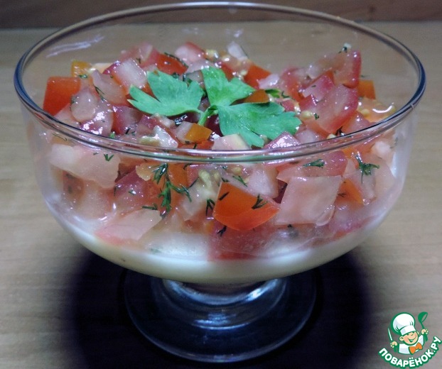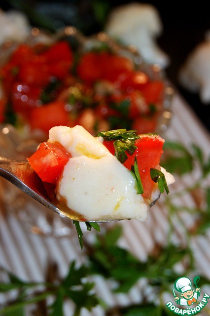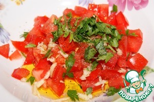 Помидоры нарезать кубиками, добавить чеснок, петрушку, масло, соль и черный перец из мельницы, лимонный сок и хорошо перемешать.