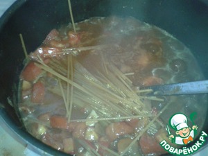 • Отправляем в кастрюлю спагетти и варим около 12 мин. После готовности спагетти мясо отправляем обратно в кастрюлю.