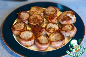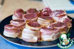 - Бекон (сырокопчёный, возьмите столько полосок, сколько будет у вас кружков вырезки) — 10 шт