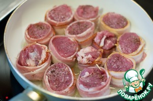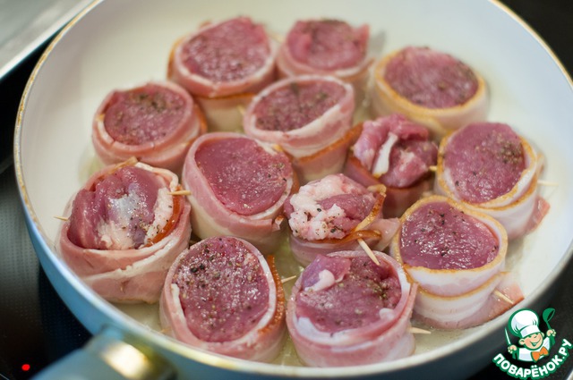 Обрезаем бекон лишний так, чтобы он ровно обвернул мясо - так будет его проще обжарить, т. е. чтобы бекон был по высоте с мясом. Заворачиваем мясо в бекон