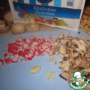 • Крабовые палочки, укроп, грибы и чеснок нарезать
