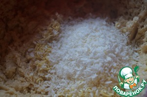 Теста получается много. Я решила разделить его на 2 части. Одну из них пустить на печенье, а вторую - на пирог. Поэтому разделила на 2 части перед добавлением муки. В часть для печенья добавила кокосовую стружку, а потом уже вымешивала с мукой. Вместо кокосовой стружки можно добавить любые цукаты, изюм, дробленые орехи, цедру цитрусовых. Таким образом, ваше печенье может играть по вашему желанию разными красками.