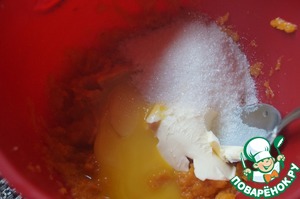 Пюре достать, разморозить, слить лишнюю жидкость и вмешать в него 2 желтка, сахар и размягченное масло. При желании можно добавить больше сахара, ориентируйтесь на ваш вкус.