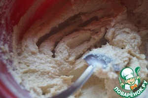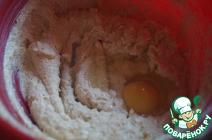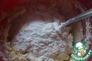 Добавить в массу разрыхлитель и муку, замесить мягкое тесто.