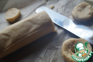 Достаём нашу заготовку для печенья из холодильника. Если она длительно хранилась в морозильнике - дать отдохнуть на столе в течение часа до размягчения. Поворачивая колбаску - нарезать круглые печенья. Для пущей красоты я выдавила в них небольшие углубления.