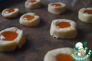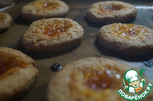 Поправляю, если необходимо, форму печенек и на расстоянии друг от друга выкладываю на противень, застеленный бумагой для выпечки. Углубления заполняю джемом. У меня - абрикосовый. Можно просто выпечь круглые печенья. Всё зависит от того, какие добавки вы делали в тесто.