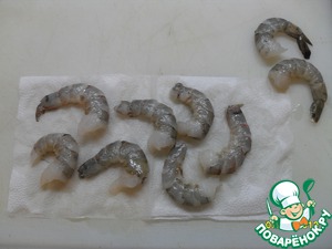 Очищаем креветки от панциря, и только две креветки оставляем с хвостом (для декора)
