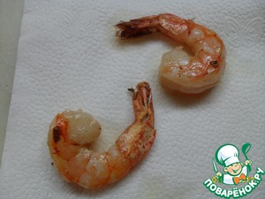Также обжариваем для украшения креветки с хвостом и выкладываем их на салфетку для удаления лишнего масла