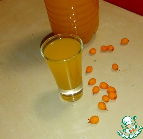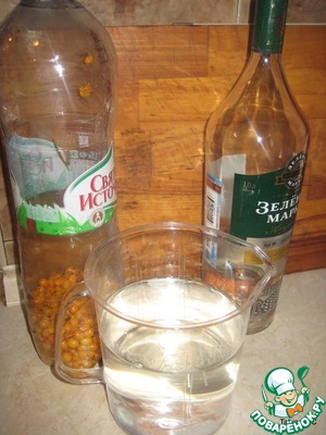Облепиху поместить в бутылку (1,5-1,6л), залить водкой и доверху (примерно 0,6л) питьевой водой. Закупорить и поставить в темное место (у меня - в шкафу) на 20 дней.