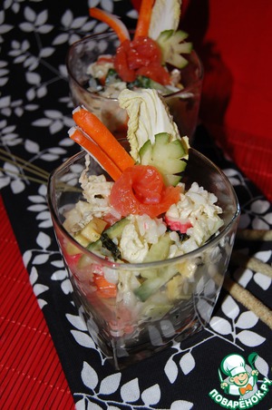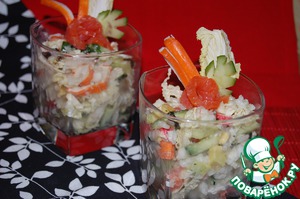 Очень вкусный, легкий и острый салат с рисом и крабовыми палочками. Для всех любителей ролkов, которым неохота их катать.