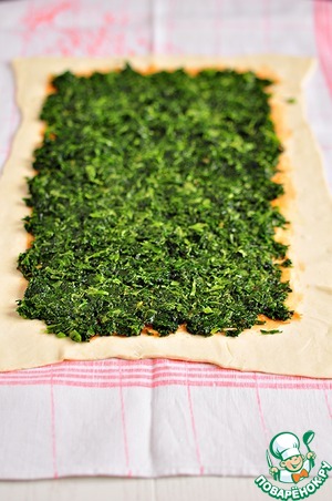 Выложить шпинат на тесто, не доходя до краёв на 1-2 см.
