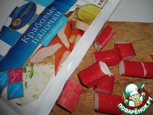 Крабовые палочки нарезаем кусочками по 2-3 см.