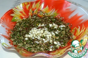 Для маринада смешиваем масло, прованские травки, розмарин, сухую петрушку, солим и перчим. Мелко рубим 2 зубчика чеснока и добавляем к маринаду