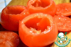 У томатов срезать "крышечку", вычистить от семян и перегородок чайной ложкой