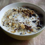 Столовую ложку сахара (если Вы любите сладкий йогурт, лучше положите побольше) и перемолотые злаки кладем в молоко и перемешиваем. Сначала хлопья всплывут, но по мере приготовления, они опустятся на дно.