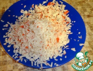 Крабовые палочки натереть на крупной тёрке и пока отложить в сторону.